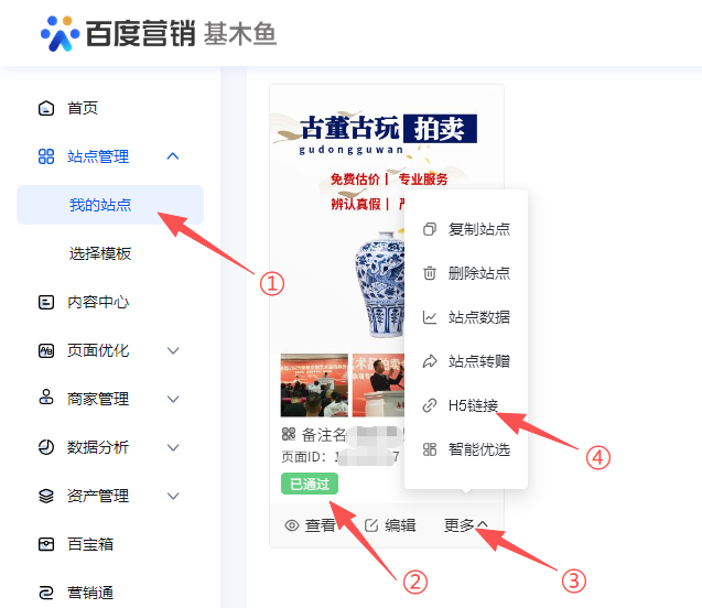 等待基木鱼页面百度审核通过后,如下图,点击 更多=>H5链接,把链接复制到推广中使用