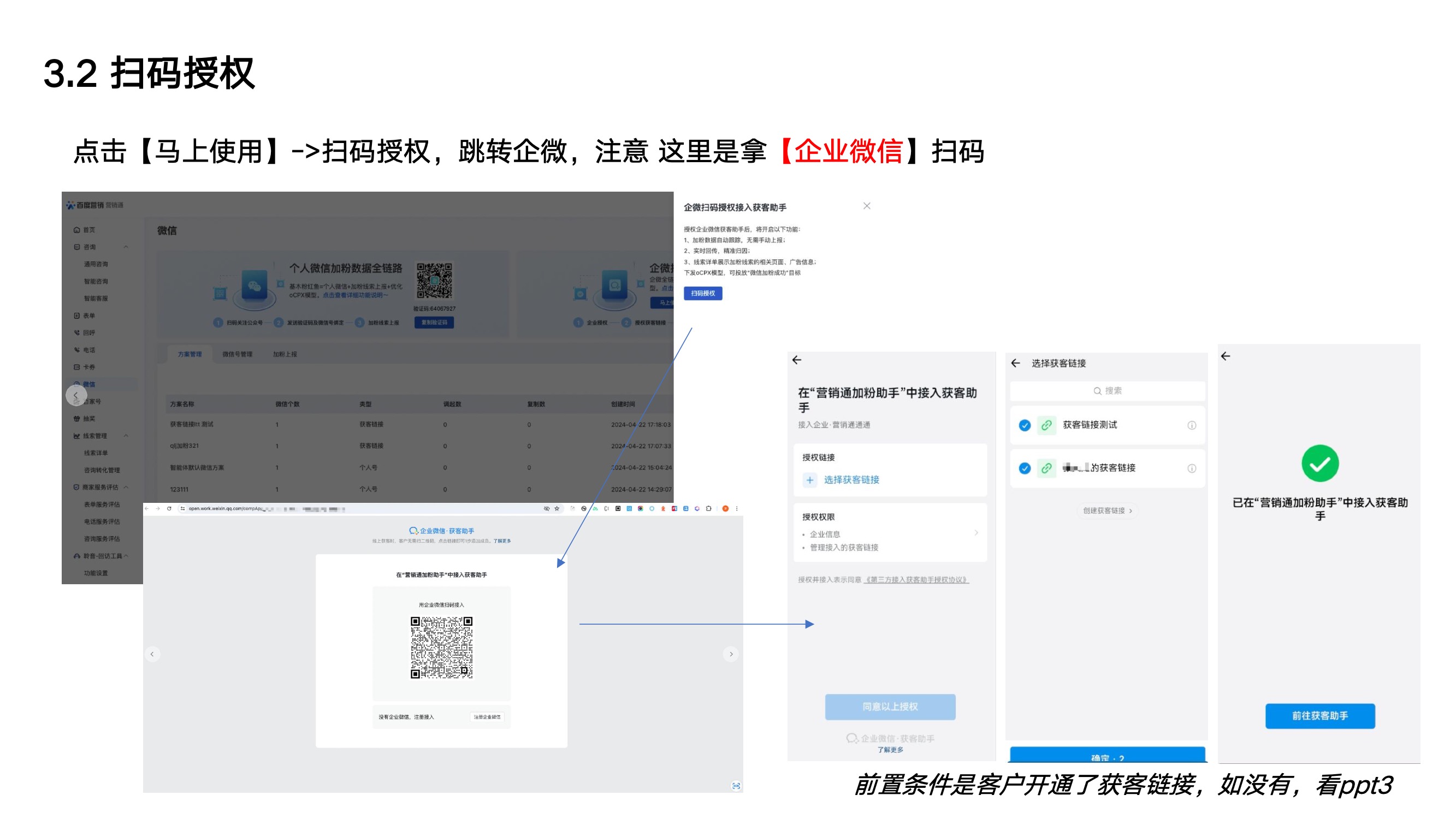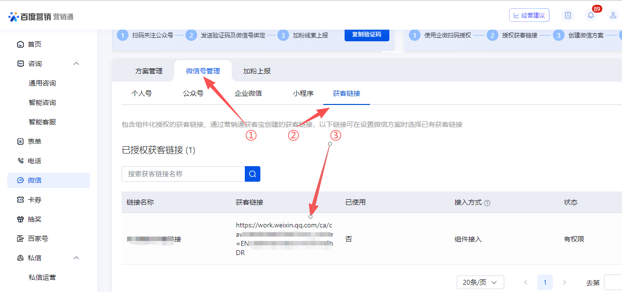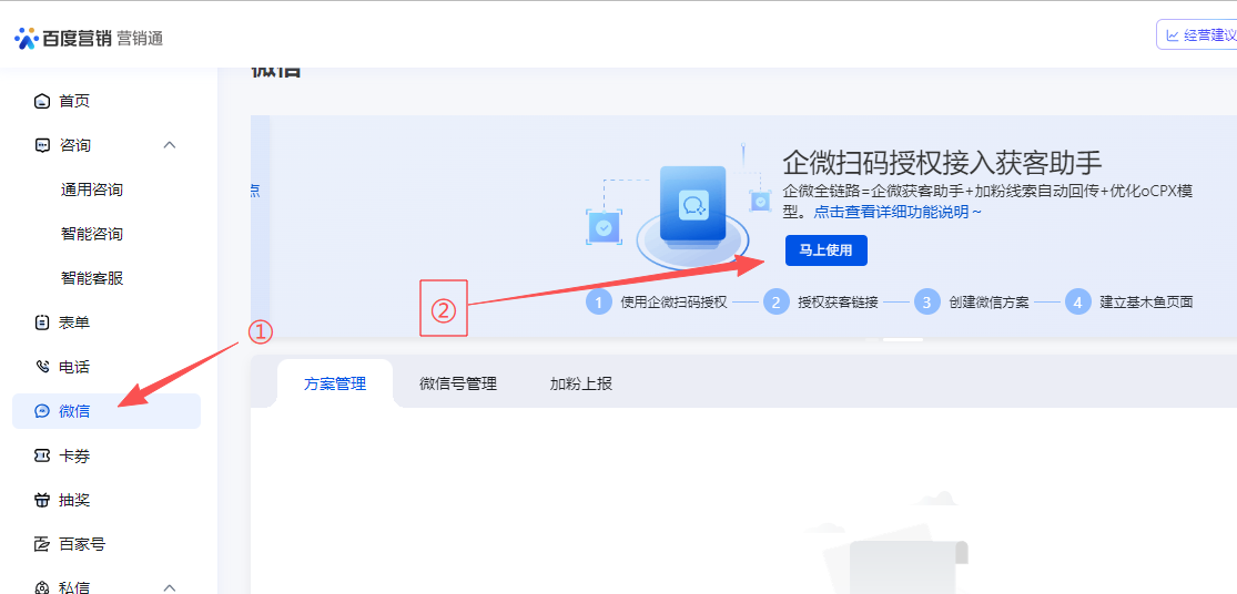 如下图①,点击微信,如下图②企微扫码授权接入获客链接,点击马上使用