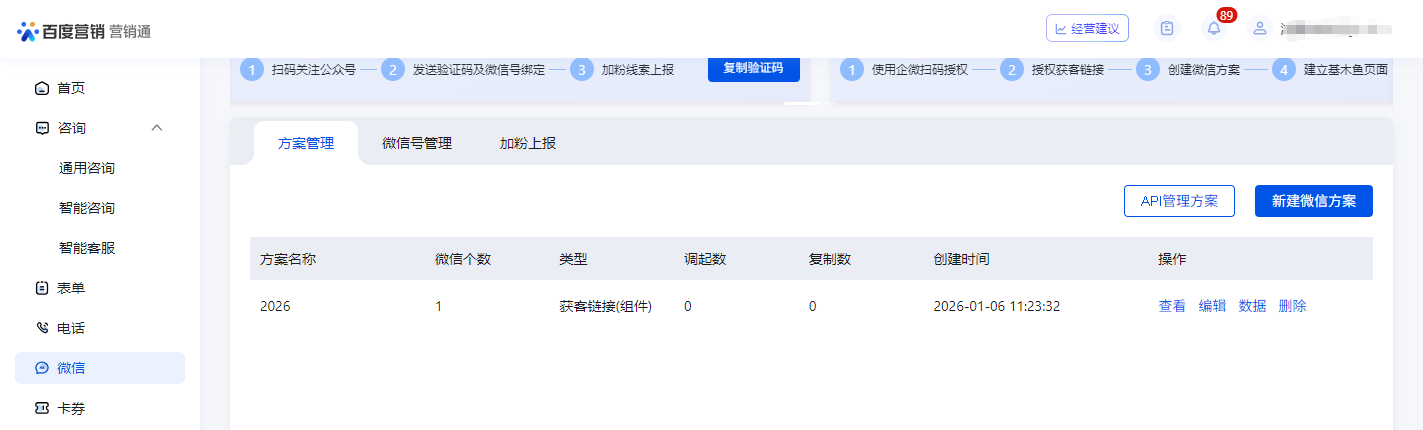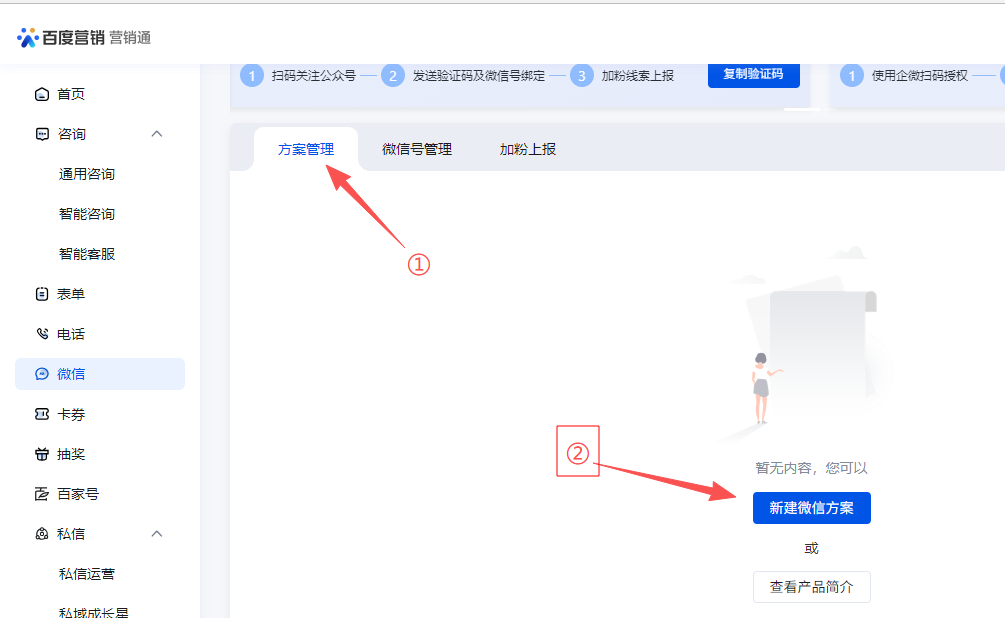 点击方案管理,新建微信方案
