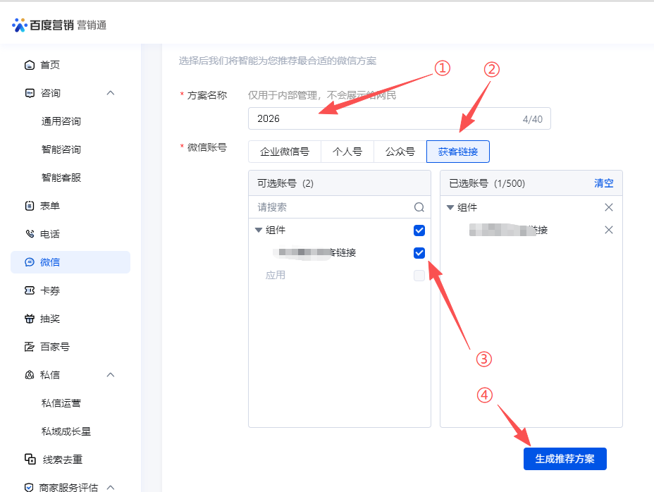 填写方案名称,点击获客链接,选择获客链接,点击生成推荐方案