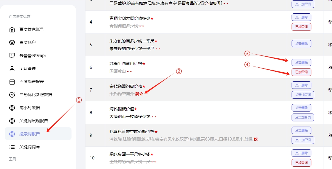 十二、查看搜索词报告 搜索词报告是百度账户里已经产生消费的关键词。 无效关键词,系统会有自动识别到也会自动设置否词或自动删除。也可以手动点击设置短语否词(下图②)、精确否词(下图④)、删除(下图③),如下图。