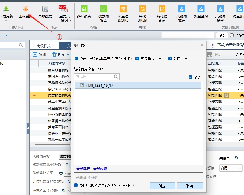 十、搭建账户设置 1、点击如下图①处,进入百度账户列表页面。 2、点击如下图②处,全选,或者选择需要设置的账户,如下图③处,勾选①②③④⑤⑦⑧⑨⑩,选择后如下图⑥处会出现一排文字,表示设置成功。 3、下图⑤处,按下面的设置: 计划设置:1379202627,69017089 单元设置:12771975444,69017089 创意设置:12771975444,69017089 关键词需包含,关键词不包含,按需要设置。需要注意的是词库里除了瓷器、玉器、字画、钱币、奇石、杂项等外,还有粮票、收购的词,不要的词在不包含里要设置排除掉,如(关键词不包含:票,购)粮票、收购的词就排除了。 按照下图设置,只有 关键词需包含,关键词不包含,按需要修改。 4、推广URL,登录百度网页端后台,到巧舱或者基木鱼中复制推广链接,填到如下图中的推广URL。