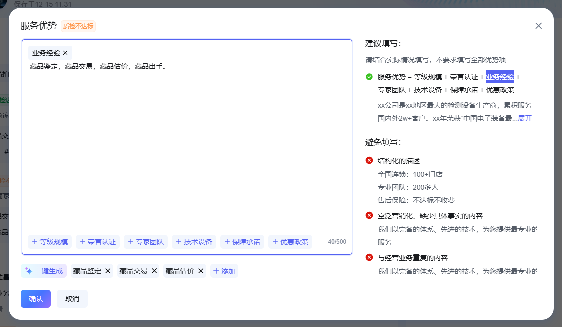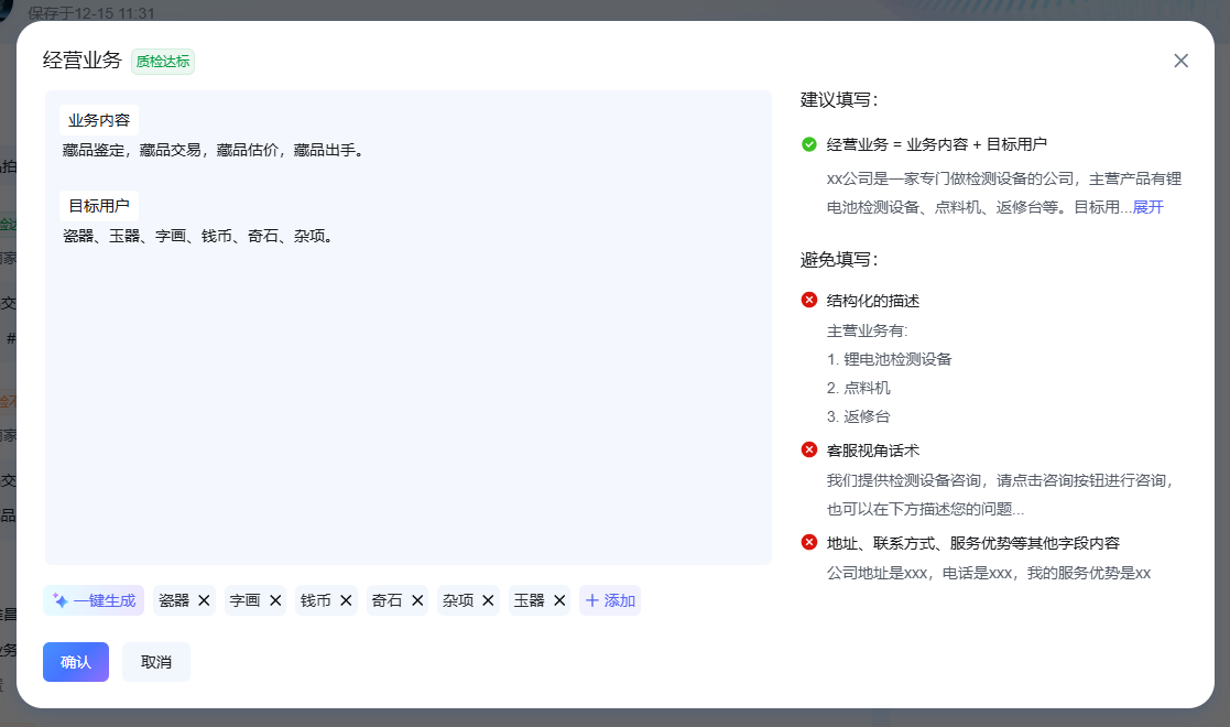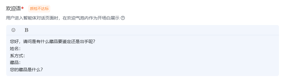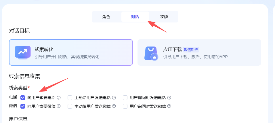 第五步、填写经营业务、服务优势、欢迎语、角色扩展信息、线索收集,如下图①②③④⑤⑥⑦处。