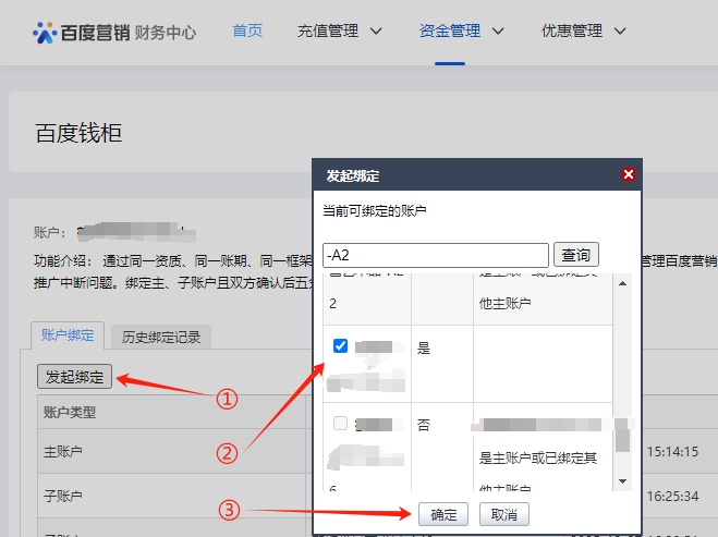 第五步、如下图,点击发起绑定,选择需要绑定的子账户,点确定