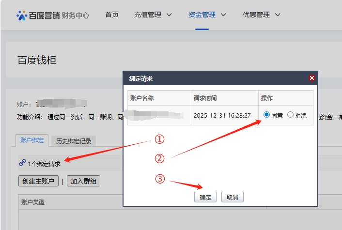 登录百度子账户,进入百度钱柜页面,如下图,点击绑定请求,同意并确定。