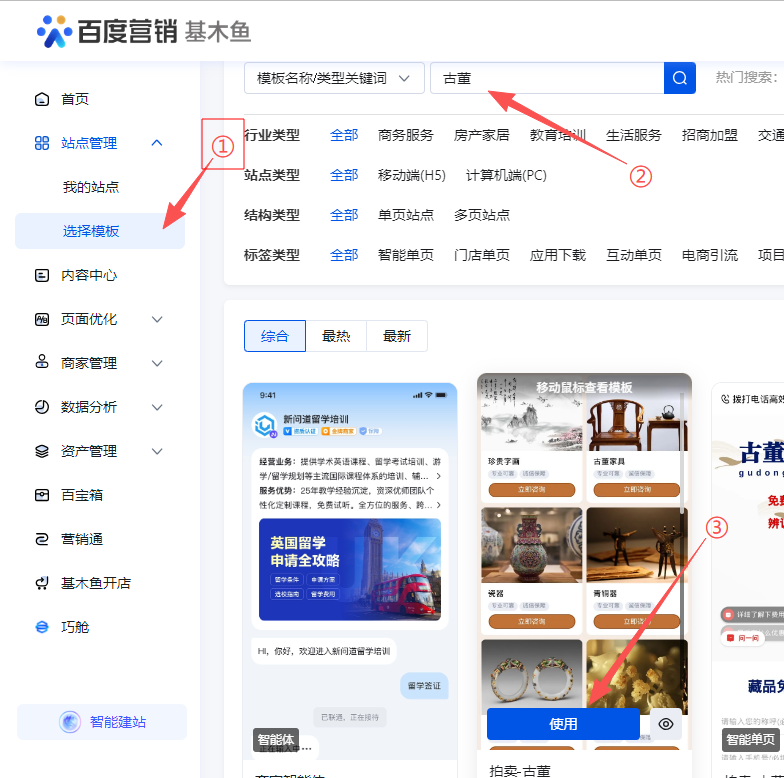 选择模板,输入关键字搜索,找到合适的目标,点击使用