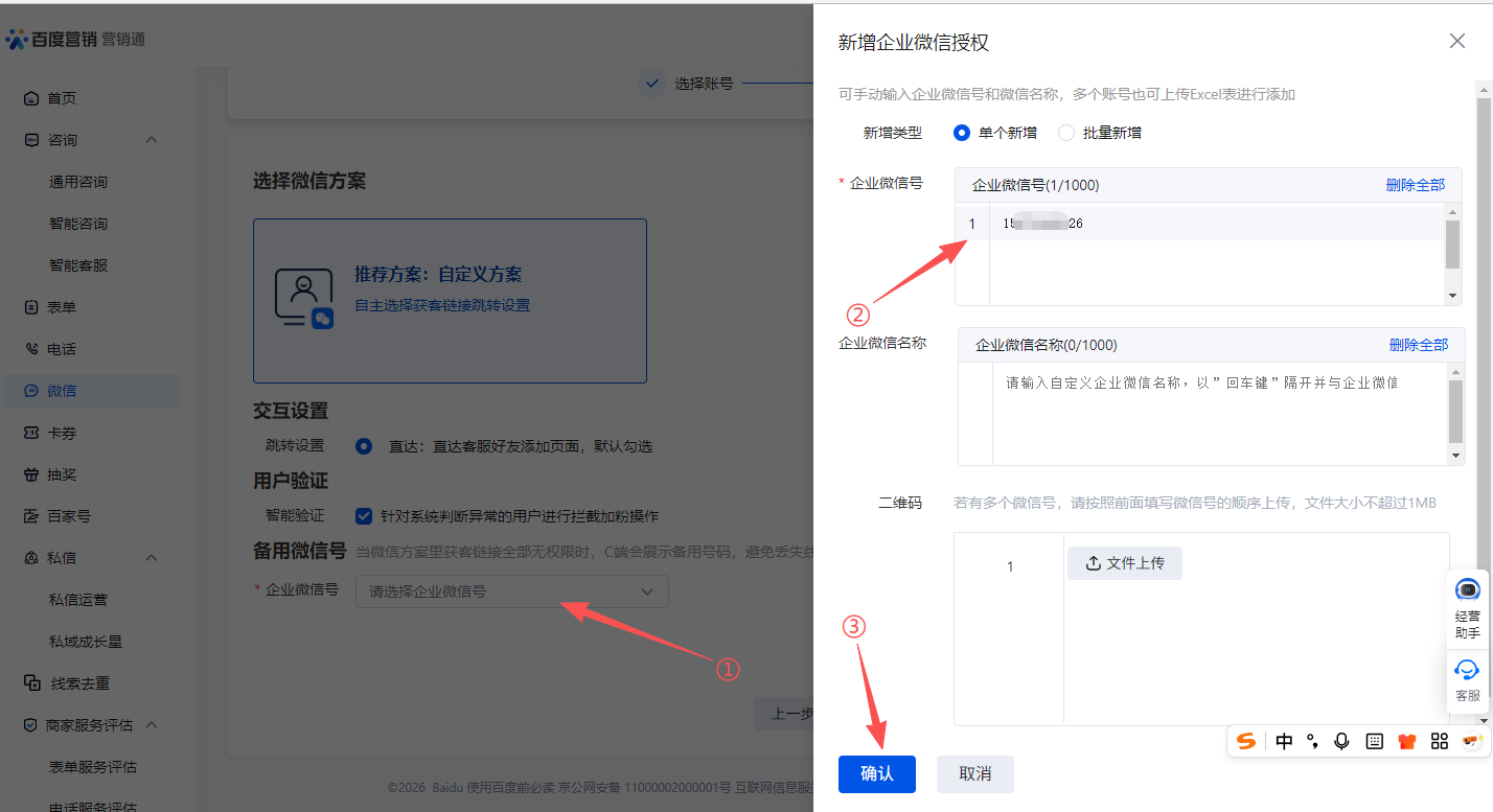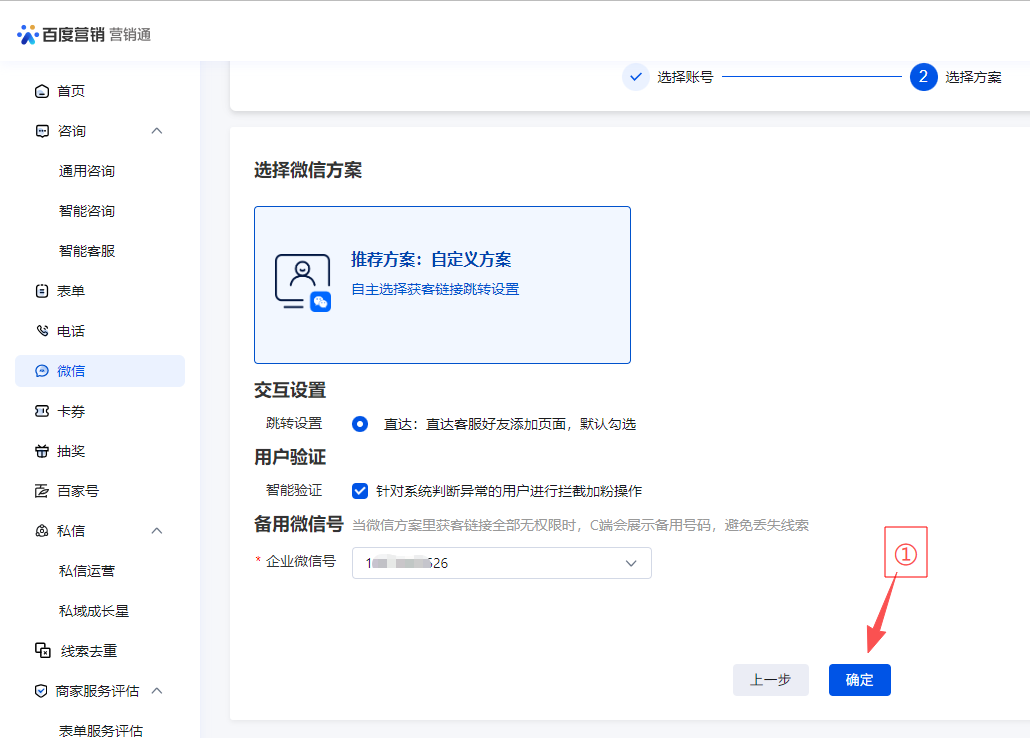 如下图①,点击微信,如下图②企微扫码授权接入获客链接,点击马上使用