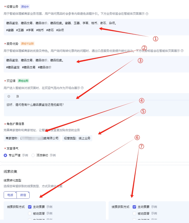 第五步、填写经营业务、服务优势、欢迎语、角色扩展信息、线索收集,如下图①②③④⑤⑥⑦处。