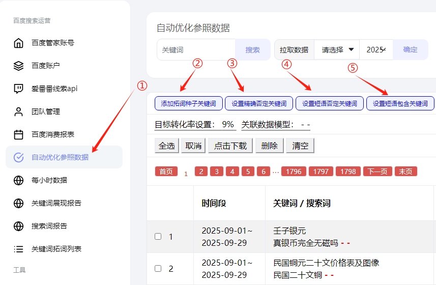 登录SEM艺术后台,点击自动优化参照数据,如下图①,点击如下图②③④⑤处分别设置添加拓词种子关键词、设置精确否定关键词、设置短语否定关键词、设置短语包含关键词。 1、种子关键词在自动搭建账户、自动拓词,必须要用到。如果不用自动搭建账户、自动拓词,则可以不设置 2、精确否定关键词,推广关键词或搜索词中,只要出现跟这里设置的精确否定关键词一样的关键词,会自动删除。可设置可不设置,系统在自动调账户中会自动添加精确否定关键词。 3、短语否定关键词,推广关键词或搜索词中,只要包含了这里设置的短语否定关键词的关键词,会自动删除、自动加否词。此处不是必须设置,但设置效果会更好。 4、短语包含关键词,推广关键词或搜索词中,只要没有包含这里设置的短语包含关键词的关键词,会自动删除、自动加否词。此处不是必须设置,但设置效果会更好。 5、设置(添加拓词种子关键词、设置精确否定关键词、设置短语否定关键词、设置短语包含关键词),是每行一个 6、拉取数据,百度账户如果有历史推广数据,可点击拉取数据,最长30天数据,系统会根据历史数据分析关键词转化率及成本,进而对低转化词删除及加否词。