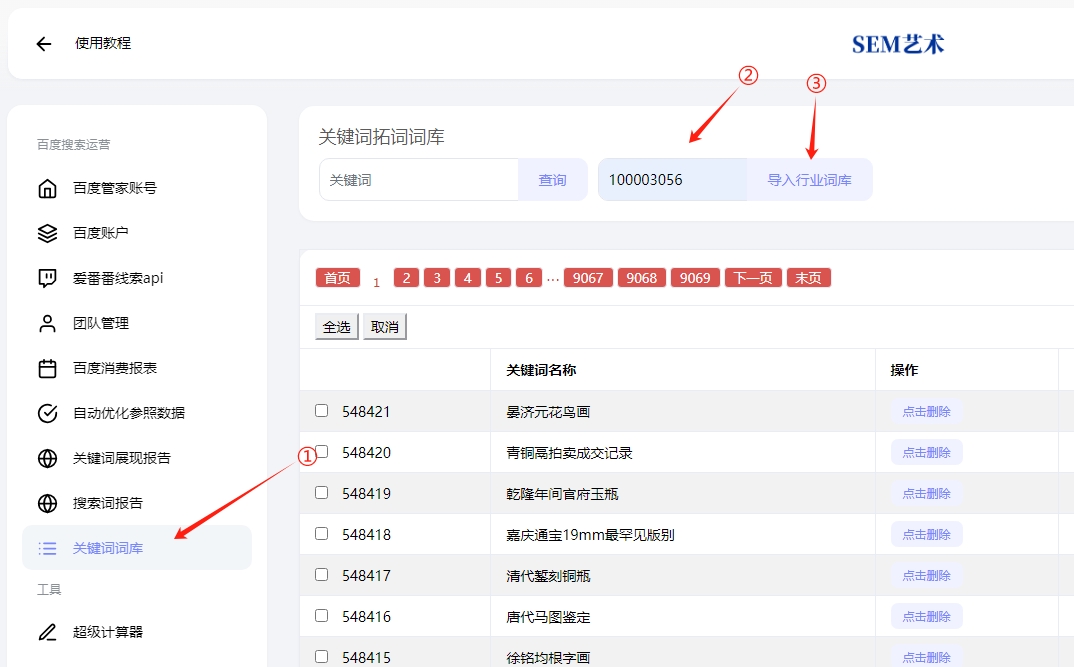 七、绑定百度账户 参考百度账户绑定教程,点击查看:https://www.semyishu.com/article/2.html 如果是多户推广,先把百度账户资质授权,绑定百度管家,百度钱柜。 1、百度批量开户资质授权教程,点击查看:https://www.semyishu.com/article/11.html 2、百度管家账户绑定教程,点击查看:https://www.semyishu.com/article/9.html 3、百度钱柜绑定教程,点击查看:https://www.semyishu.com/article/10.html 八、导入艺术品行业词库 点击如下图①处【关键词词库】,输入行业词库ID:100003056,点击【导入行业词库】