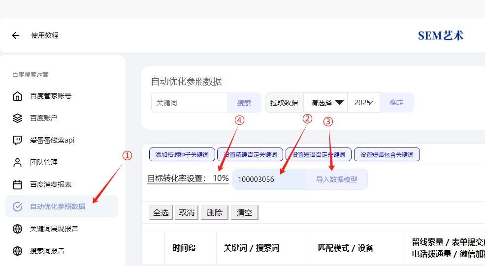 九、导入艺术品行业数据模型 点击如下图①处【自动优化参照数据】,输入数据模型ID:100003056,点击【导入数据模型】 点击 设置短语否定关键词、设置短语包含关键词,进去查看,如果有内容为导入成功。