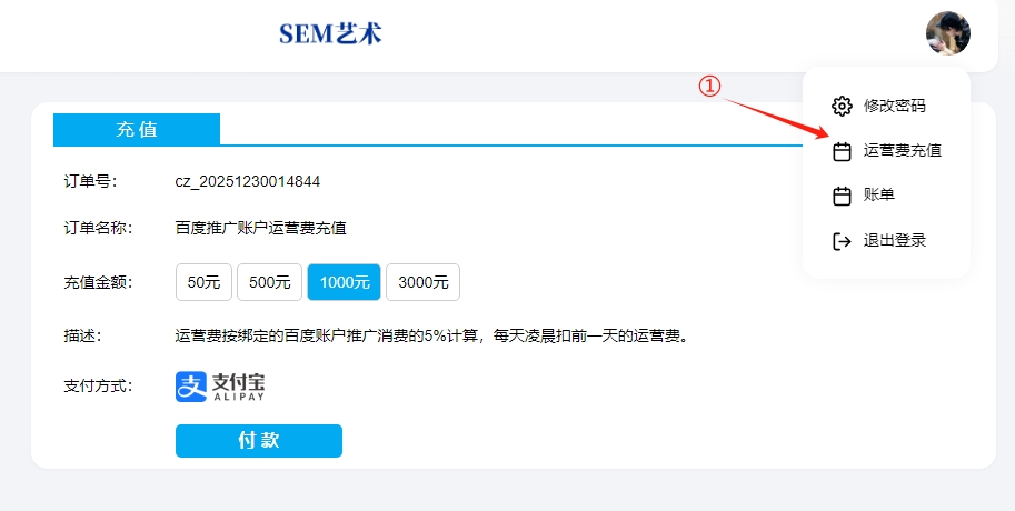 一、百度开户 联系百度公司或者百度代理商开户。 百度官方开户网址(https://e.baidu.com/),百度官方直营只有北京、上海、广州、深圳、佛山、苏州、东莞、天津,这几个地区有直营,其他地区的都是代理商,建议联系广州百度官方直营的开户,有时需要他们百度客服工作配合比较顺畅。 二、登录百度账户 百度营销网页端(https://www2.baidu.com)登录百度账户。 电脑上安装百度营销客户端,下载网址(https://editor.baidu.com/),登录百度账户。 三、设置巧舱页面 参考巧舱设置教程,点击查看:https://www.semyishu.com/article/3.html ps:推在线咨询的可以设置巧舱页面,推加粉页面的另外做推广页面。 ps:可以让百度官方的运营帮我们做好推广页面。 四、爱番番API接入 爱番番API接入设置教程,点击查看:https://www.semyishu.com/article/4.html ps:推在线咨询的话需要设置爱番番API接入,推加粉的话不用设置。 四、百度推广物料激活 百度推广物料激活设置教程,点击查看:https://www.semyishu.com/article/14.html 五、注册登录SEM艺术网站账号 SEM艺术官网:https://www.semyishu.com/ ps:账号密码尽量使用数字或字母,不要使用中文字符,因为中文字符在设置免密登录链接时,大部分浏览器无法识别。 六、SEM艺术系统运营费充值 如下图,点击头像处=>运营费充值。