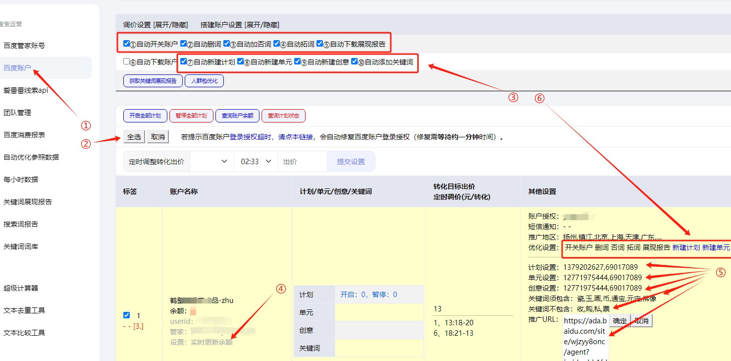 十、搭建账户设置 1、点击如下图①处,进入百度账户列表页面。 2、点击如下图②处,全选,或者选择需要设置的账户,如下图③处,勾选①②③④⑤⑦⑧⑨⑩,选择后如下图⑥处会出现一排文字,表示设置成功。 3、下图⑤处,按下面的设置: 计划设置:1379202627,69017089 单元设置:12771975444,69017089 创意设置:12771975444,69017089 关键词需包含,关键词不包含,按需要设置。需要注意的是词库里除了瓷器、玉器、字画、钱币、奇石、杂项等外,还有粮票、收购的词,不要的词在不包含里要设置排除掉,如(关键词不包含:票,购)粮票、收购的词就排除了。 按照下图设置,只有 关键词需包含,关键词不包含,按需要修改。 4、推广URL,登录百度网页端后台,到巧舱或者基木鱼中复制推广链接,填到如下图中的推广URL。