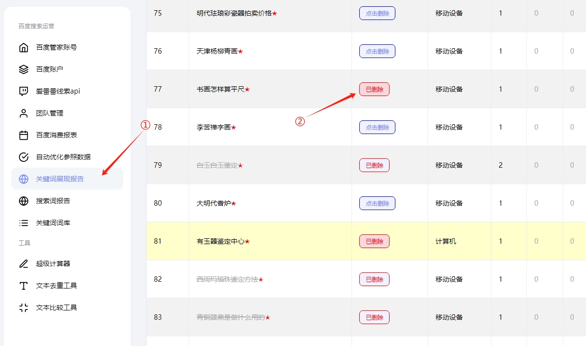 按照以上流程,搭建账户已经设置完成,系统会自动上传物料到账户中。 接下来是日常调整账户需要做的工作。 十一、查看展现报告 展现报告是百度账户里已经有最新展现的关键词,这些关键词可能还没产生点击消费,如果能及时查看发现一些无效的关键词,及时删除,可以节省非常多的广告成本。 无效关键词,系统会有自动识别到也会自动删除。也可以手动点击删除,如下图。
