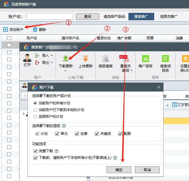 十三、删除关键词 电脑端打开百度营销助手,如下图添加账户,勾选账户,打开账户,如果太久没下载账户的话,如下图②先下载更新,如下图全部选择,点确定,下载。