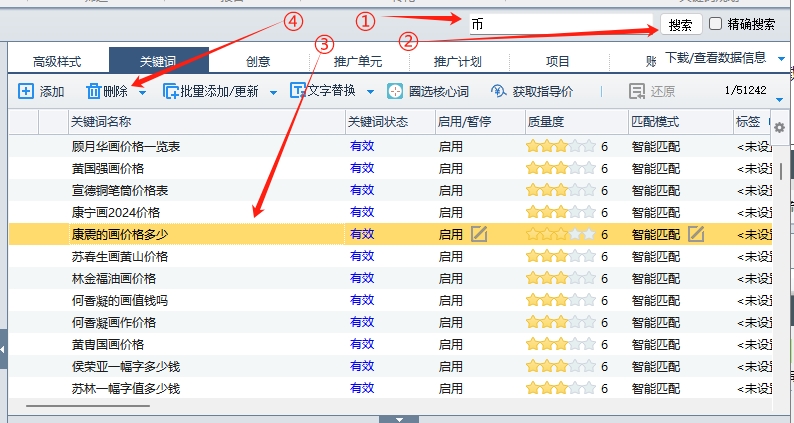 如下图①处搜索需要删的关键词,如想去掉钱币的词,输入“币”,点搜索,如下图②处,选择想要删的词,黄色为选中的,点击如下图④处删除